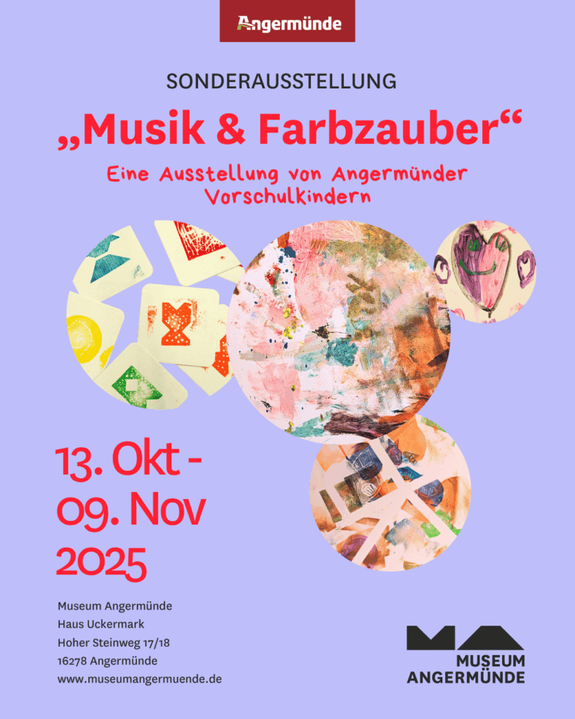 Die farbenfrohen Ergebnisse des Aktionstages können nun in einer Sonderausstellung im Museum Angermünde bewundert werden. Unter dem Titel „Musik und Farbzauber“ werden vom 13. Oktober bis 9. November 2025 vielfältige Arbeiten der Kinder präsentiert. Ob Leinwandbilder zum Thema „Stadt der Zukunft“, große Kita-Gemeinschaftsbilder als Ergebnis des Actions Paintings oder die Druckprodukte aus der Museumswerkstatt – hier ist ganz besondere und absolut sehenswerte Kunst aus Kinderhand zu bestaunen.