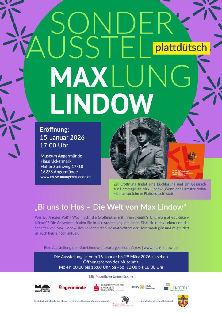 Anlässlich des 150. Geburtstags des uckermärkischen Heimatdichters Max Lindow widmet sich das Museum Angermünde einer besonderen Sonderausstellung. Unter dem Titel „Bi uns to Hus – Die Welt von Max Lindow“ gibt sie Einblicke in das Leben und Schaffen des bekanntesten Heimatdichters der Uckermark.