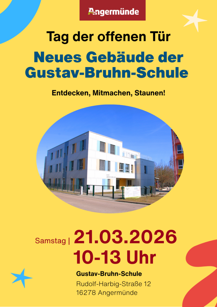Nach der feierlichen Einweihung im Juli vergangenen Jahres öffnet der neue Schulergänzungsbau der Gustav-Bruhn-Grundschule nun erstmals seine Türen für die Öffentlichkeit. Die Stadt Angermünde als Träger der Grundschule und des Hortes sowie das Team des Hortes „Abenteuerland“ und das Schulteam laden herzlich zum Tag der offenen Tür ein.
